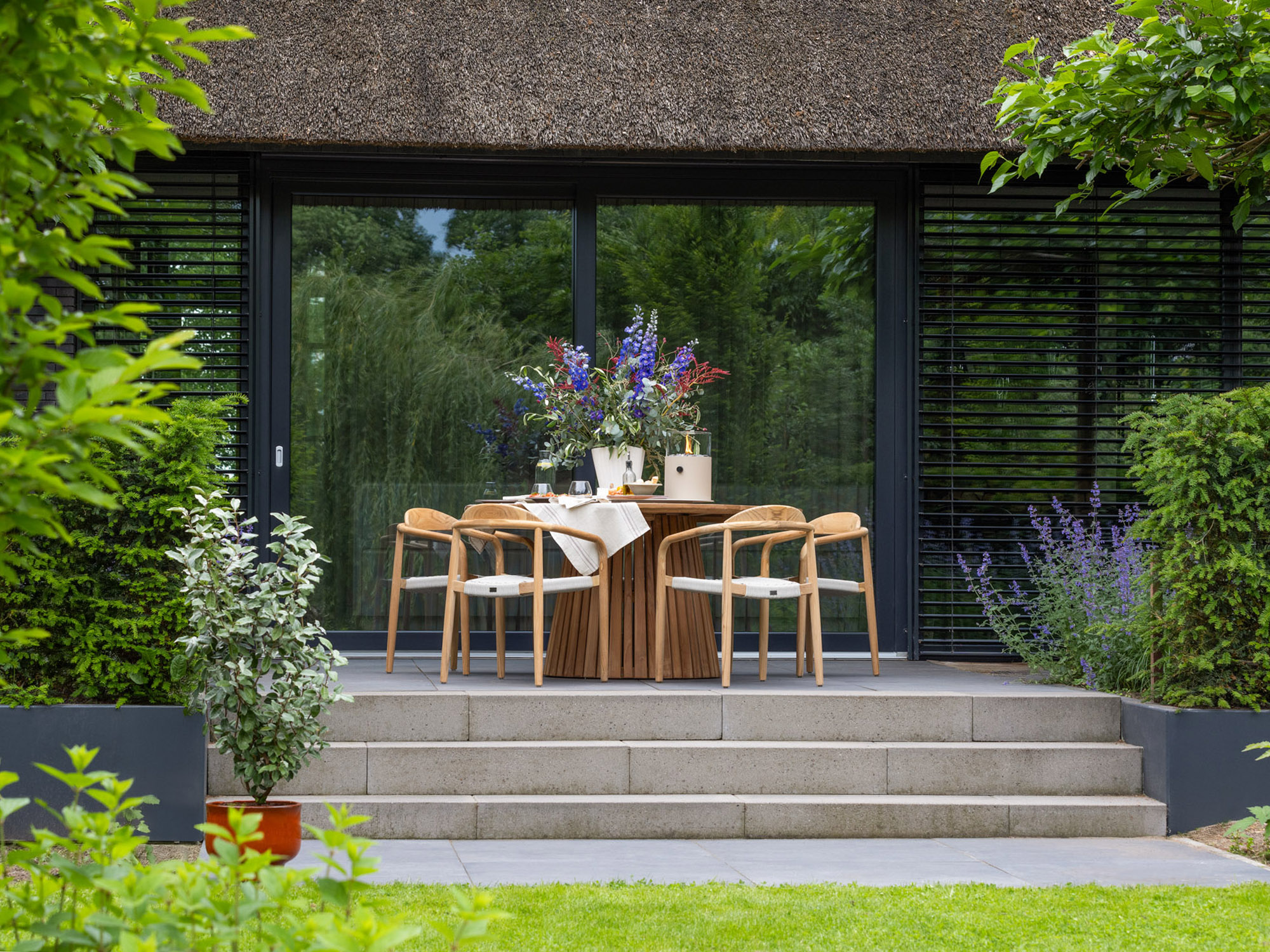 Stevig teakhouten frame: Het teakhout is bestand tegen alle weersomstandigheden en biedt een stevige constructie die netjes is afgewerkt zonder splinters. Ideaal voor jarenlang buitenplezier!