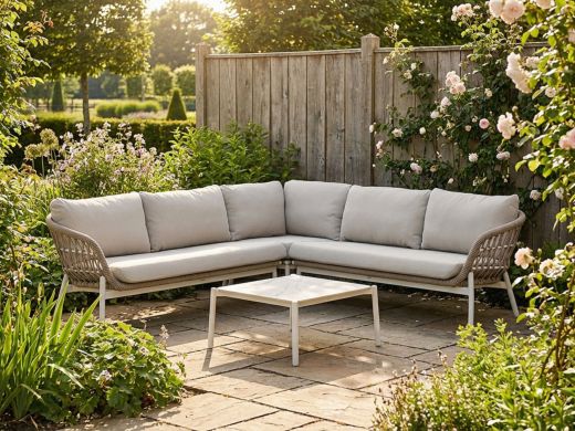 De Bellagio Cupello hoek loungeset is zo’n set waar je al zin in krijgt als de zon maar even doorkomt. Deze 4-delige blikvanger biedt plek voor vijf personen en combineert een strakke uitstraling met slimme materialen. Het aluminium frame is licht, roestvrij en onderhoudsarm, en het sintered stone tafelblad blijft netjes – ook als je er met glazen, borden of kinderhandjes aan zit. De zachte kussens zorgen voor het comfort, de vorm voor rust en ruimte in je tuin. En ja, hier val je zomaar een keer in slaap – maar daar is zo’n plek ook voor.