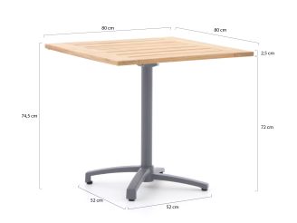 Compacte 80 cm tafel (4 personen): Past makkelijk op kleinere terrassen en balkons, zonder krap aan te voelen. Ruim genoeg voor borden, schalen en een borrelplank, of een potje kaarten met z’n vieren.