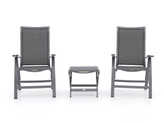 De Bellagio Lugo/Pronto balkonset is als een goede buur die altijd klaarstaat voor een praatje en een kop koffie. Deze 3-delige set in stijlvol Royal Grey is perfect voor jouw balkon of knusse tuinhoekje. De stoelen zijn verstelbaar, zodat je altijd de juiste houding vindt, of je nu een boek leest of geniet van de zon. Het aluminium frame is licht en roest niet, waardoor je de set makkelijk kunt verplaatsen zonder je zorgen te maken over het weer. Het textileen van de zitting en het tafelblad vormt zich comfortabel naar je lichaam en is bovendien onderhoudsarm. Zo houd je meer tijd over voor de dingen die er echt toe doen: ontspannen en genieten van het buitenleven.