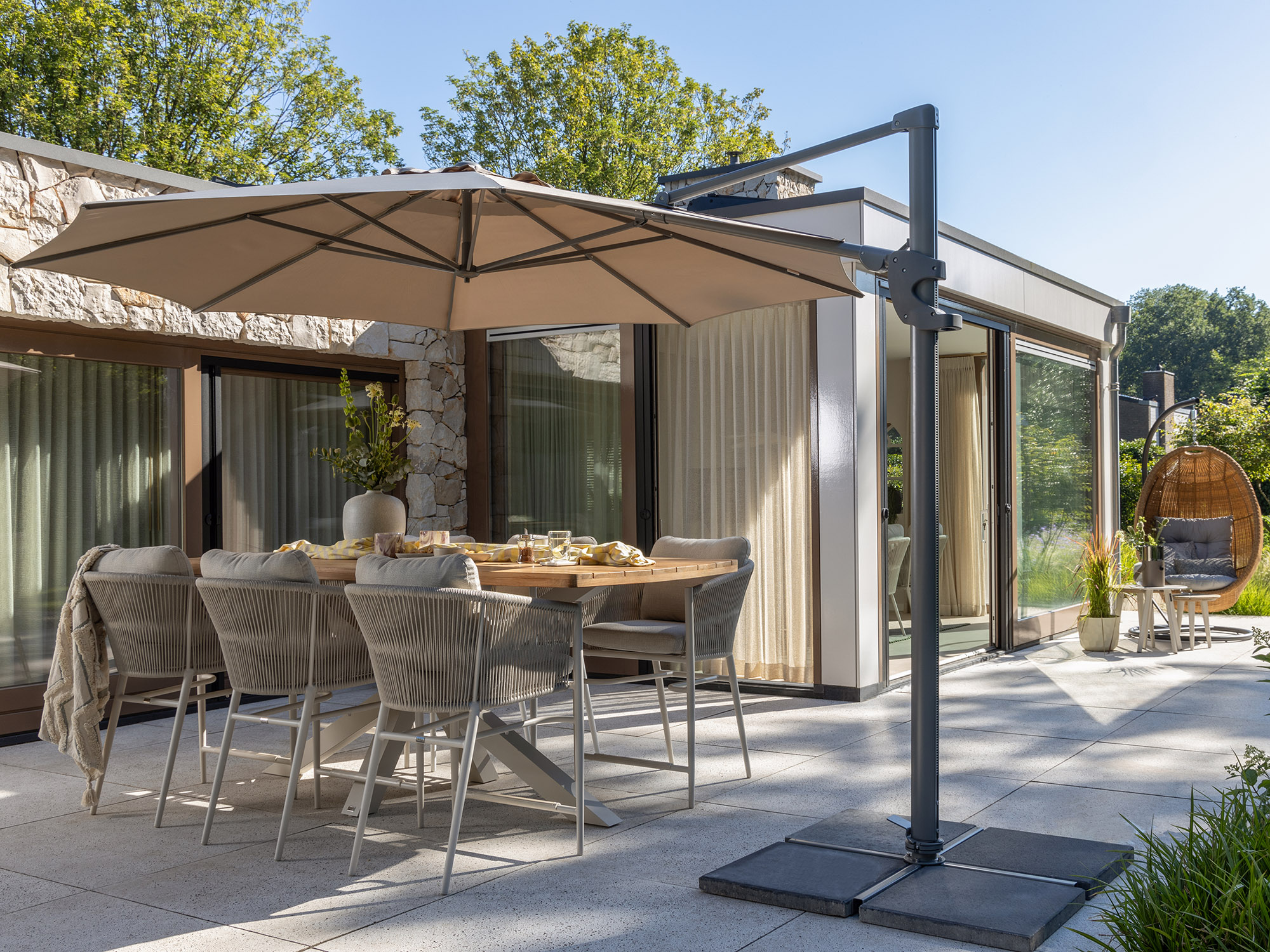 Wil je je tuinset extra beschermen tegen water en vuil? Dan kun je een beschermende laag aanbrengen met de Kees Smit Teak & Hardhout shield voor het teakhouten blad en de Kees Smit Textiel & Rope beschermer voor de rope zittingen. Zo blijft je tuinset langer mooi en hoef je minder vaak schoon te maken. Dat is wel zo fijn!