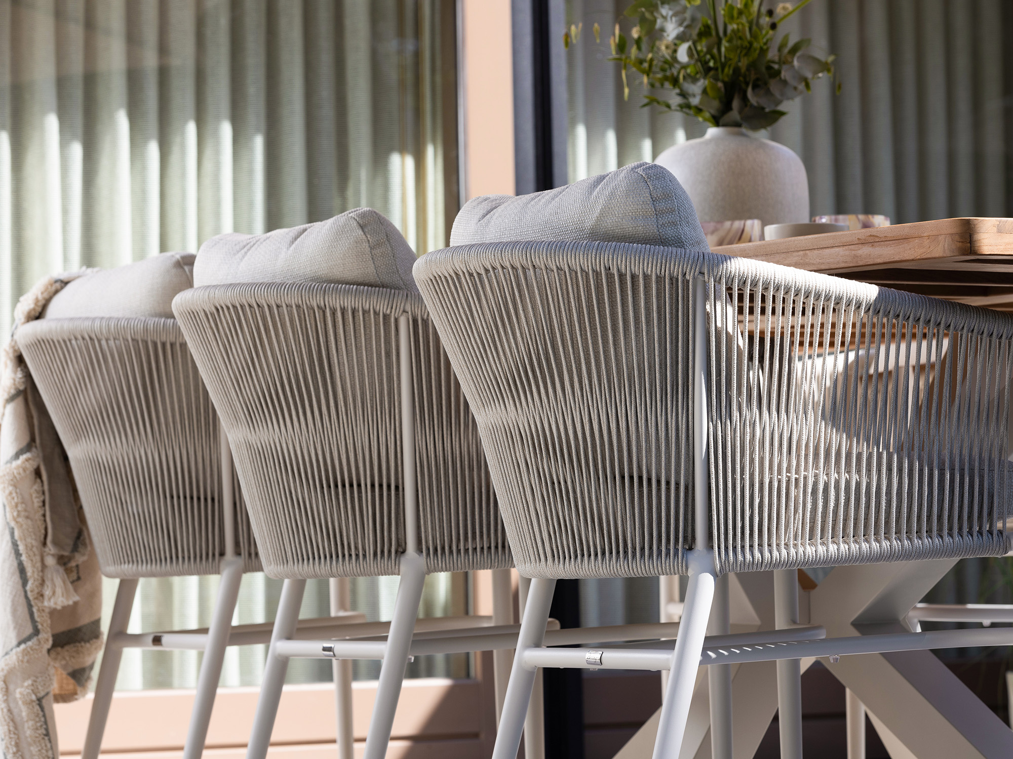 • Rope zitting met kussens: De strak gespannen rope zitting met bijgeleverde kussens zit stevig en comfortabel, ook als je een lange avond blijft hangen.