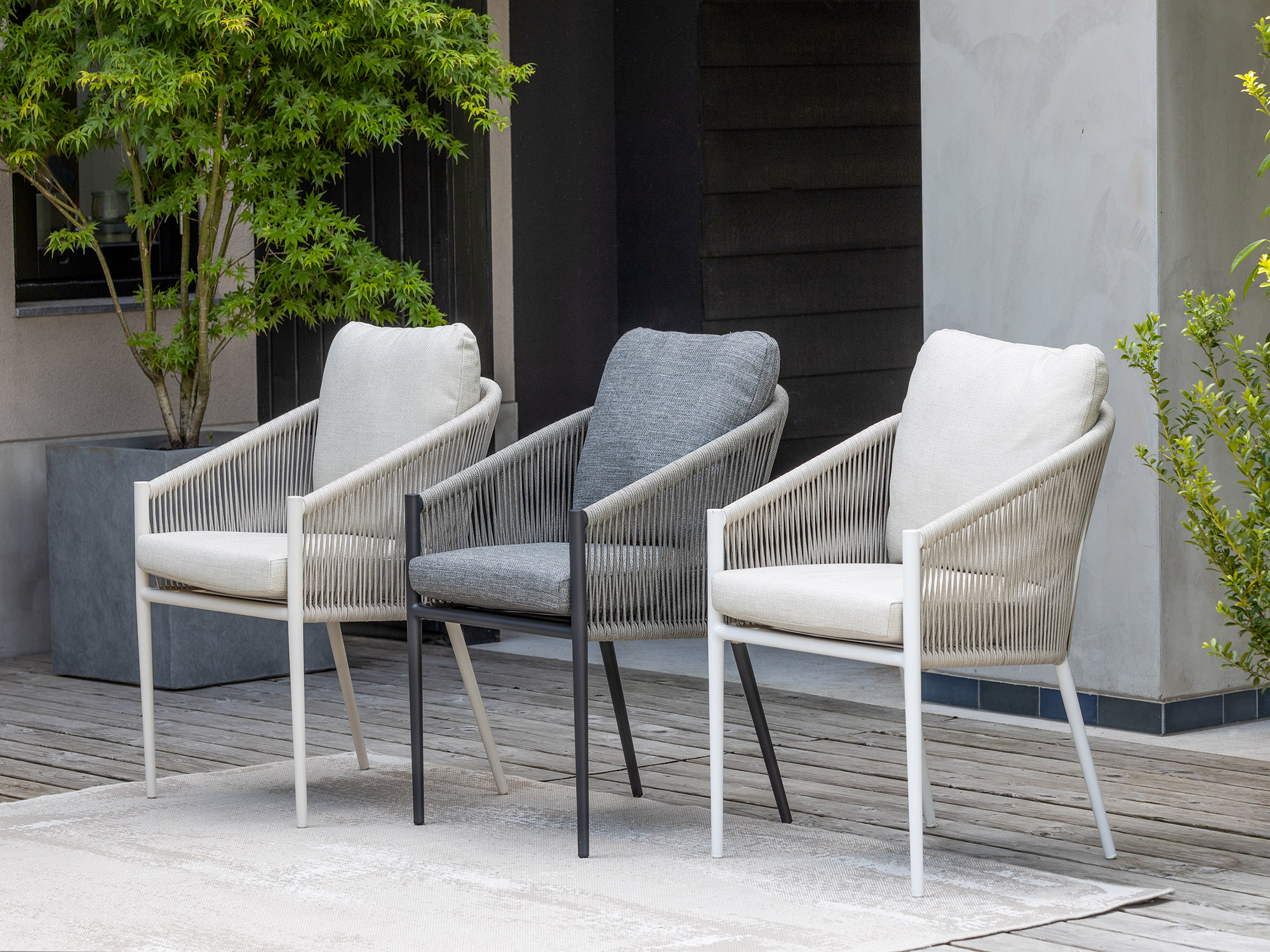 Comfortabele rope zitting: De stoelen zijn voorzien van een zitting die niet heet wordt in de zon en zorgt voor een prettig zitcomfort.