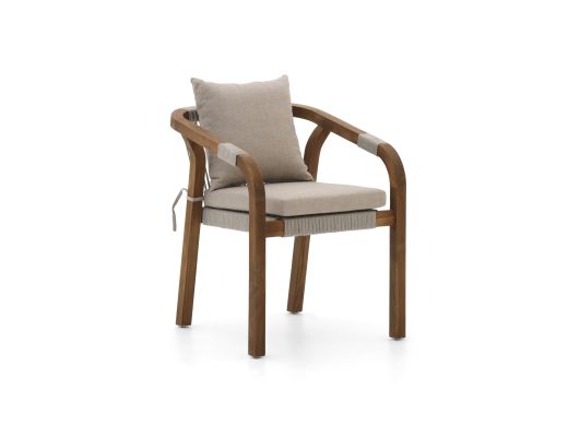De Bellagio Perzano dining tuinstoel beige is een stapelbare tuinstoel voor wie graag lang aan tafel zit en zijn terras netjes en ruim wil houden. De zitting en rug van rope vormen zich licht naar je lichaam, waardoor je prettig zit tijdens een etentje of een borrel. Dankzij het teakhouten frame heb je een sterke tuinstoel die goed tegen verschillende weersomstandigheden kan. Rope droogt snel na een regenbui en wordt niet heet in de volle zon, waardoor je de stoel het hele seizoen veel kunt gebruiken.