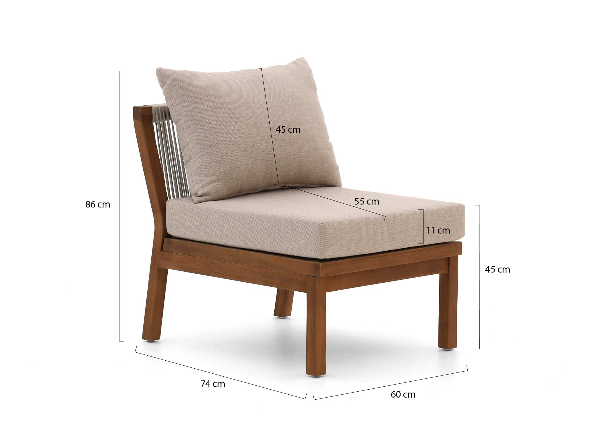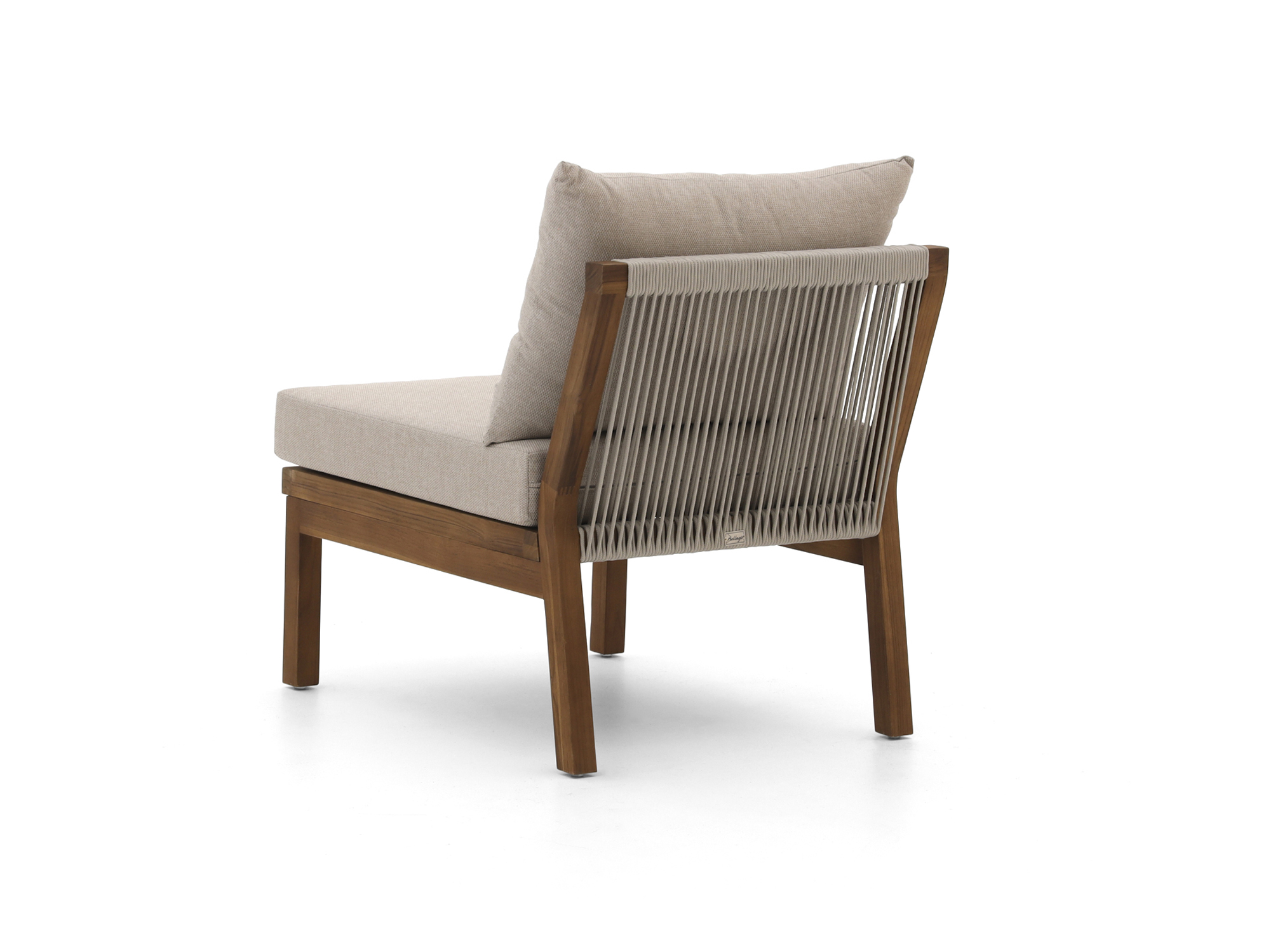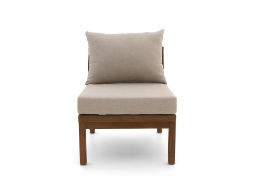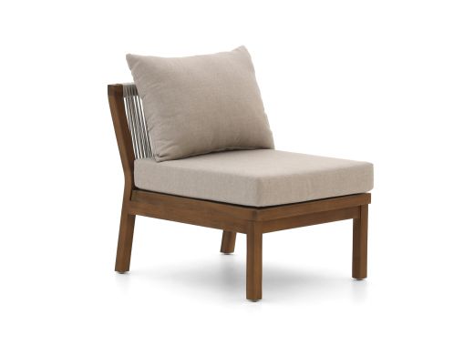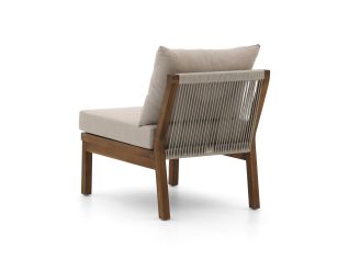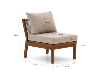 De Bellagio Perzano lounge tussenmodule is een losse loungestoel zonder armleuningen, ideaal als extra zitplek of om je bestaande Perzano loungeset uit te breiden. Het frame is van teakhout, een sterk natuurproduct dat goed tegen alle weersomstandigheden kan, zodat je niet bij elke regenbui hoeft te slepen. De zitting en rug zijn afgewerkt met rope in lichtgrijs, dat snel opdroogt na een bui en niet heet wordt in de zon, waardoor je ook op warme dagen relaxed blijft zitten. De kussens in grijs hebben afritsbare hoezen, dus die haal je er makkelijk af om schoon te maken na een drankje dat nét niet in je glas bleef. Deze tussenmodule is vooral handig als je net één zitplaats tekortkomt, of als je jouw hoekopstelling wat langer wilt maken.
