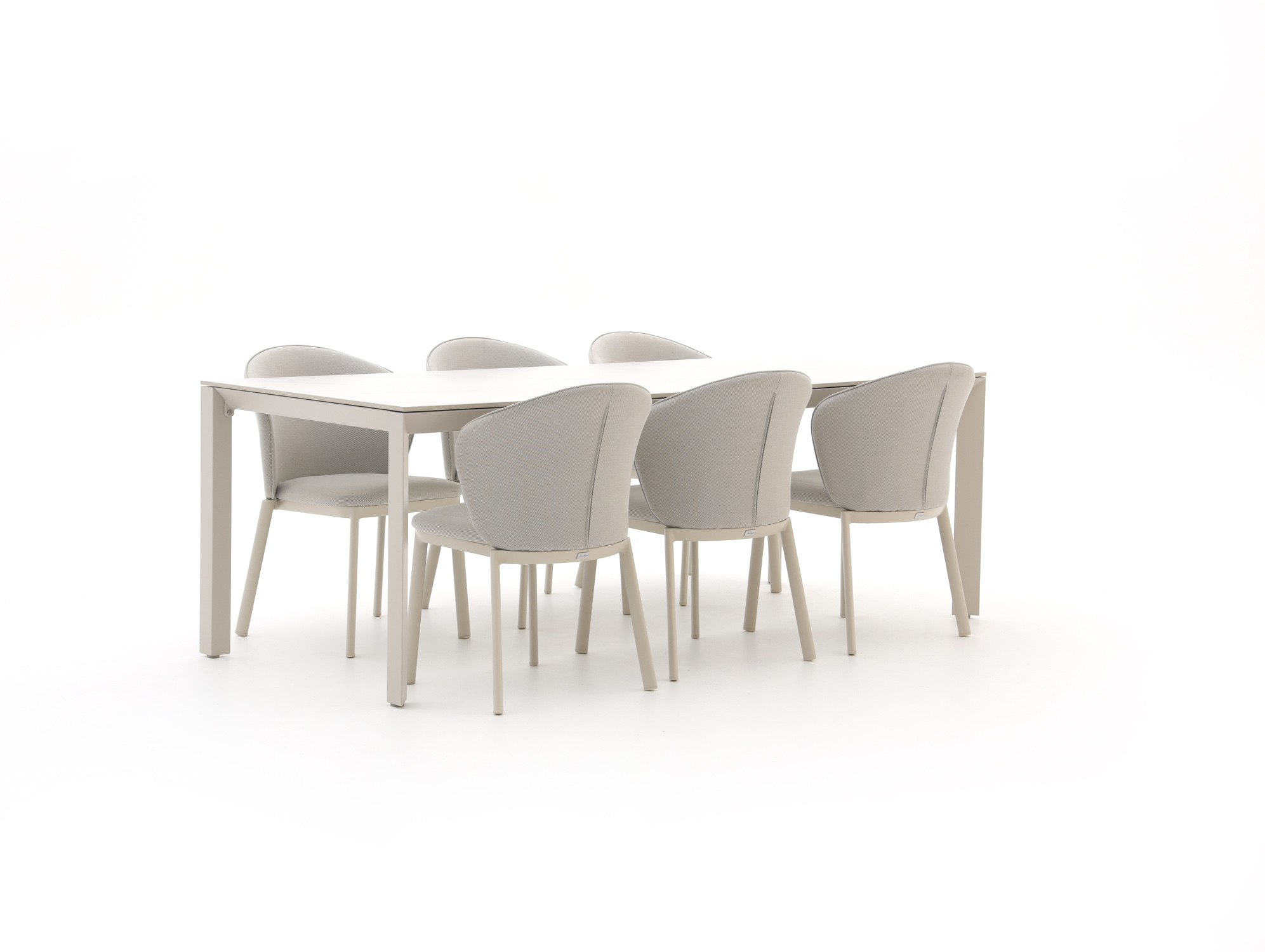 De Bellagio San Lupo/Sestino dining tuinset is een ruime tuinset voor 6 personen, ideaal als je graag buiten eet met familie of vrienden aan een lange, rechte tafel. De tafel van 220 cm biedt genoeg plaats voor borden, pannen en een paar schalen extra, zonder dat je hoeft te schuiven. Het aluminium van de stoelframes is licht van gewicht, dus je trekt de stoelen makkelijk aan en schuif je ze zo weer aan de kant. Het sintered stone tafelblad in wit geeft een strakke, rustige look en is gemaakt om buiten tegen een stootje te kunnen. Deze set past goed als je een ruim terras hebt en vooral wilt gebruiken om lekker lang buiten te tafelen.
