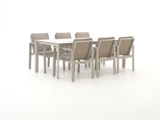 De Bellagio Vazzola/Sestino dining tuinset is een ruime eettafelset voor 6 personen, ideaal als je graag buiten eet met je gezin of vrienden. De set wordt geleverd met kussens, zodat je direct lekker zacht zit en niet eerst nog losse kussens hoeft te zoeken. Het sintered stone tafelblad in wit geeft een strak en rustig beeld op je terras, en is tegelijk erg sterk en goed geschikt voor buiten. Zoek je een set om regelmatig aan te ontbijten, borrelen en eten, dan zit je met deze 220 cm lange tafel gewoon goed.