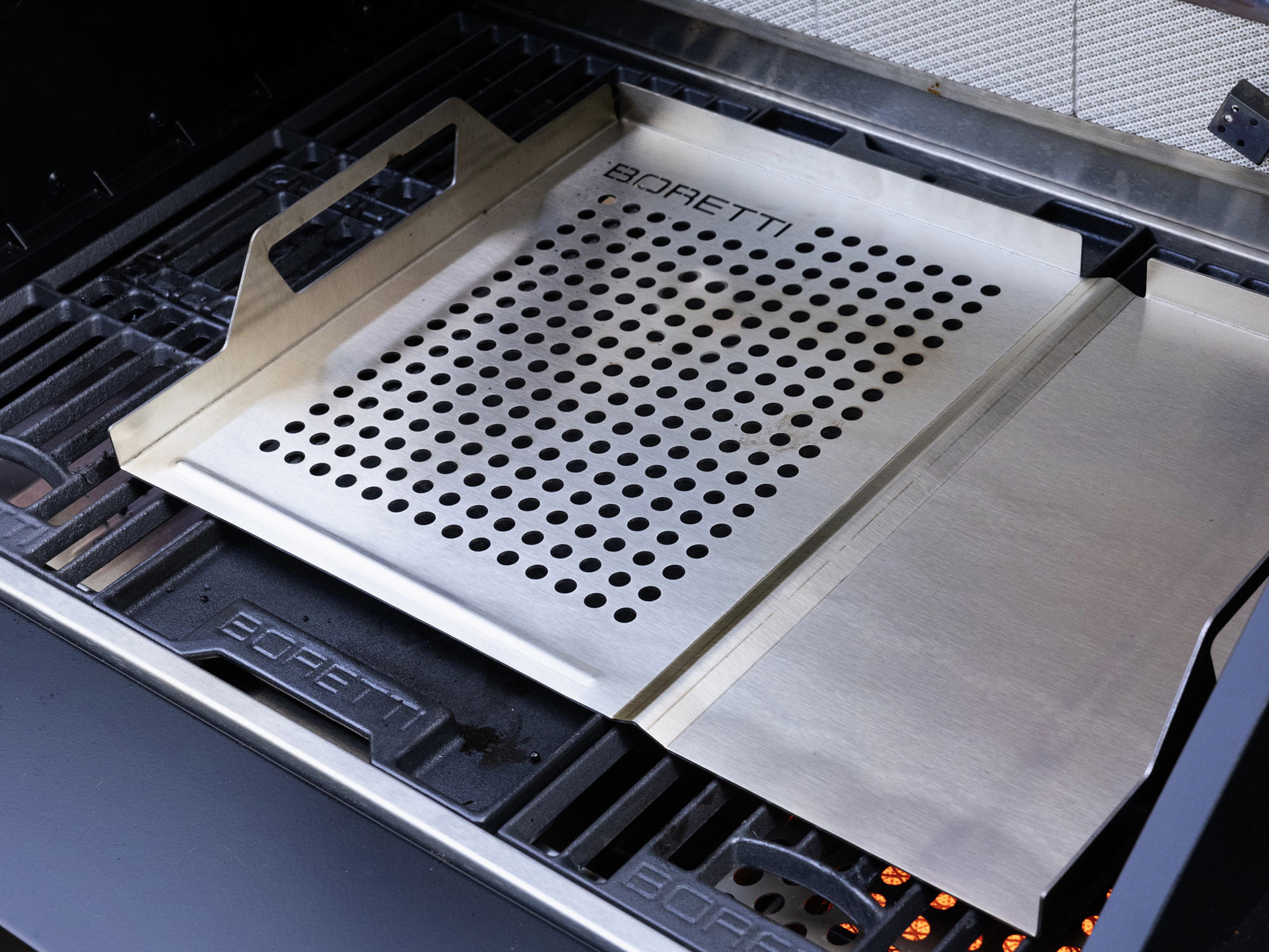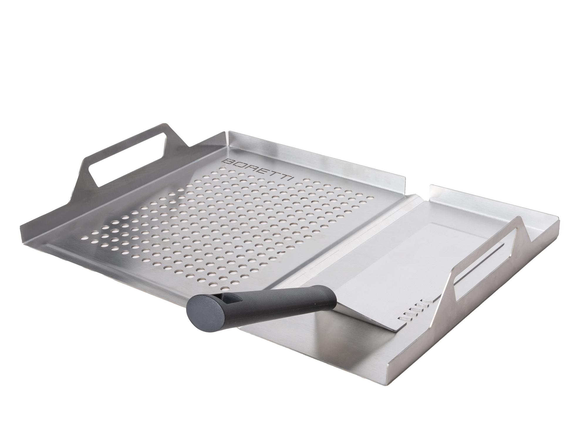 Met de Boretti 2-in-1 grill tray met spatel haal je een praktisch hulpmiddel in huis voor je barbecue-avonden. Deze RVS set combineert een grill tray met een bijpassende spatel, zodat je tijdens het grillen snel en makkelijk kunt werken. Ideaal wanneer je kleine groentes, garnalen of stukjes vlees wilt bereiden zonder dat ze door het rooster vallen.