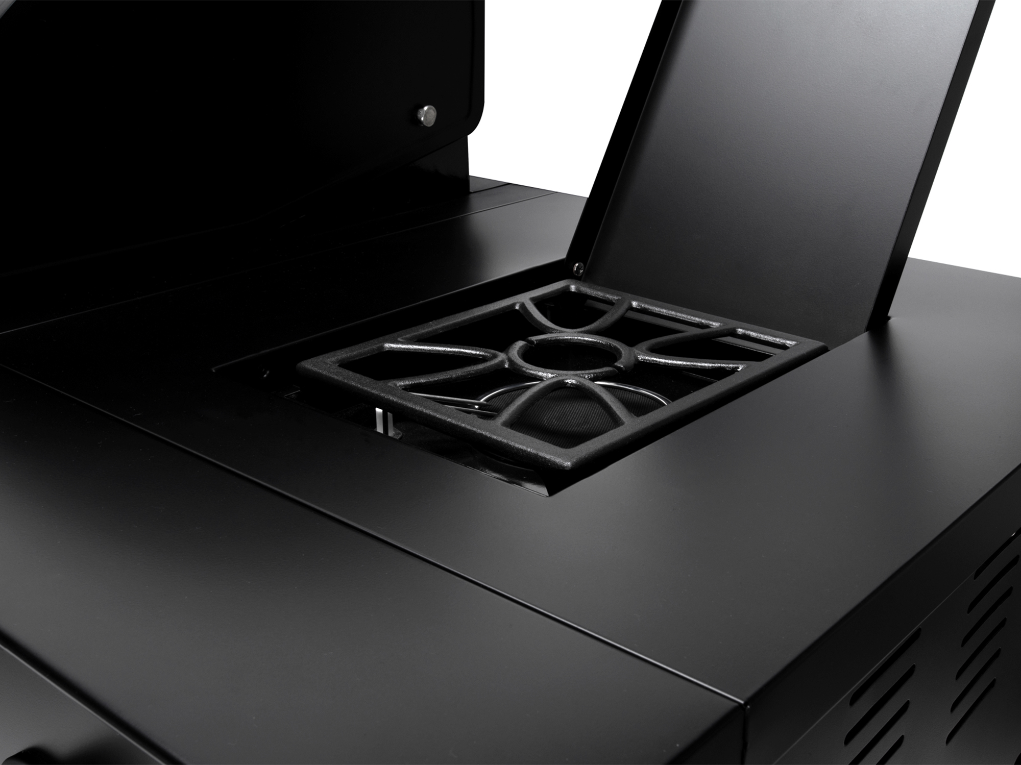 • Dankzij de drie gietijzeren roosters en de gietijzeren bakplaat kun je verschillende gerechten tegelijk en met gelijkmatige warmte bereiden
