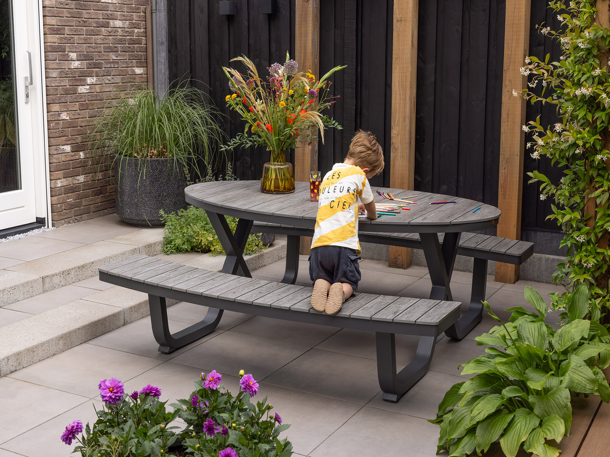 Ruimtebesparend ontwerp: Een picknicktafel neemt weinig ruimte in beslag, perfect voor kleinere tuinen of terrassen.
