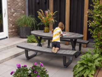 De Bellagio Fidenza picknicktafel is de perfecte aanvulling voor jouw tuinavonturen. Met zijn ruime afmetingen biedt deze tafel plaats aan zes personen, ideaal voor gezellige etentjes in de buitenlucht. Het tafelblad is gemaakt van Polywood in een stijlvolle Grey Oaklook, wat de charme van hout combineert met de voordelen van kunststof: het is water- en vuilafstotend en trekt niet krom. Het aluminium onderstel zorgt ervoor dat de tafel niet alleen stevig is, maar ook onderhoudsarm en licht van gewicht. Dus, of je nu een barbecue organiseert of gewoon geniet van een kopje koffie in de zon, deze picknicktafel is jouw trouwe metgezel. En zeg nou zelf, wat is er nu leuker dan samen buiten tafelen?