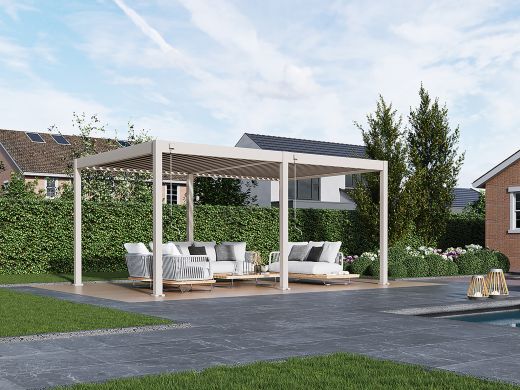 Deze royale pergola is perfect te combineren met accessoires die zorgen voor een beschutte en sfeervolle buitenruimte.