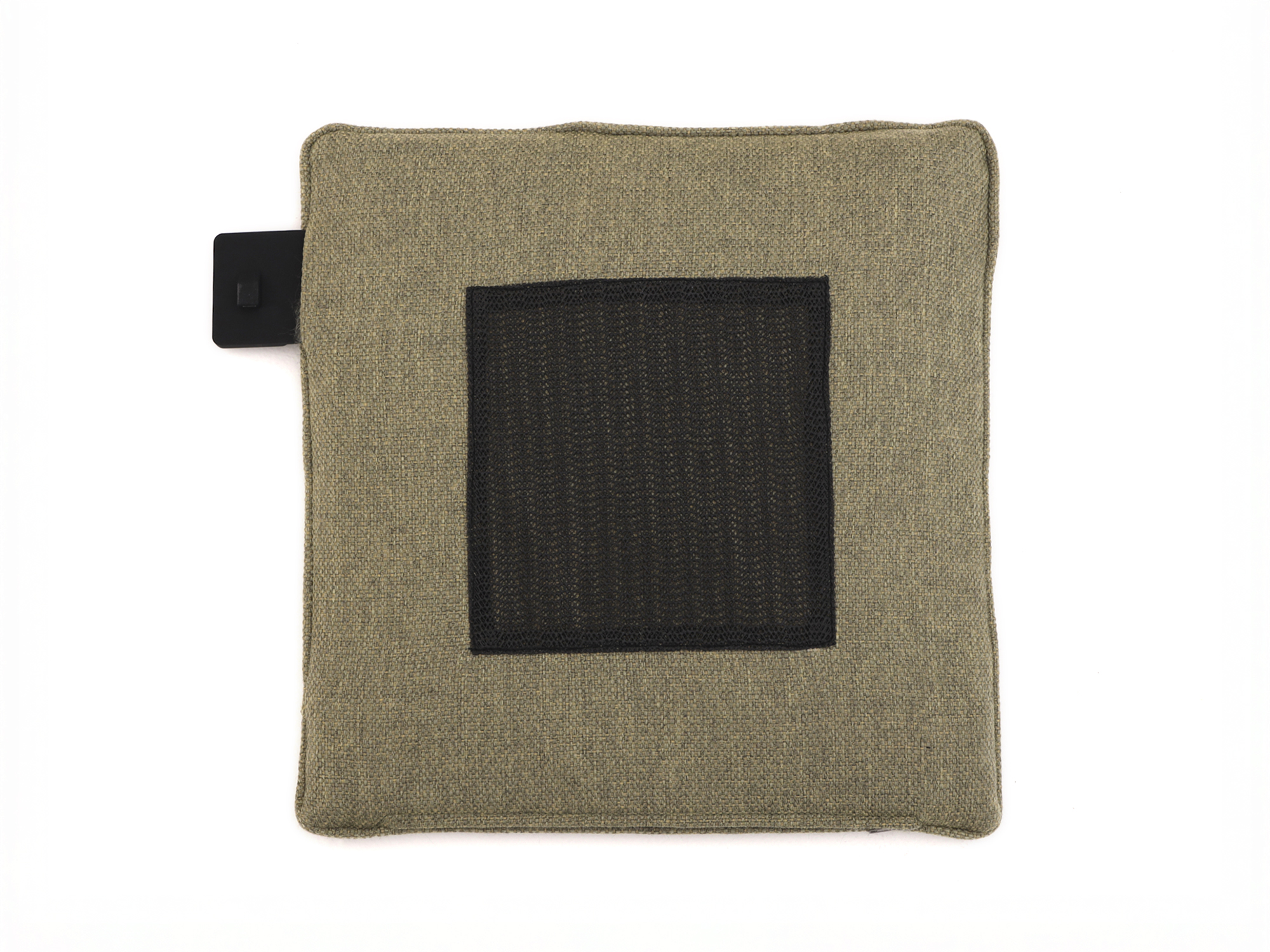 - Aansluiten – Plaats de opgeladen powerbank in het vakje achter de rits en sluit de kabel aan.