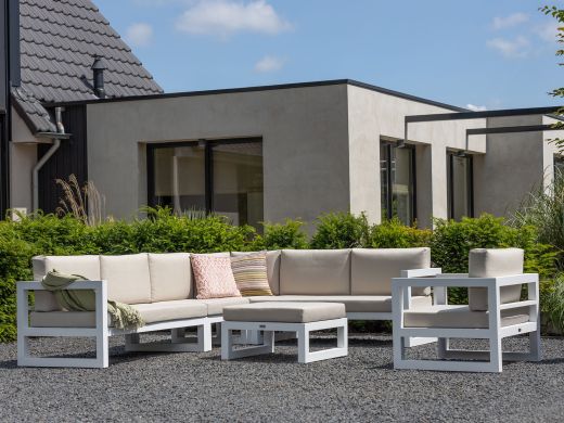 De Forza Calleo loungemodule met linkerarm is een stijlvolle toevoeging aan je tuin of terras. Met zijn strakke witte kleur en comfortabele kussens biedt deze module niet alleen een moderne uitstraling, maar ook een heerlijke plek om te ontspannen. Het aluminium frame is licht van gewicht en onderhoudsarm, waardoor je meer tijd hebt om te genieten van het buitenleven. Of je nu een bestaande set wilt uitbreiden of een nieuwe opstelling wilt creëren, deze module biedt je de flexibiliteit die je zoekt. Een ideale keuze voor wie houdt van comfort en stijl in de tuin, zonder gedoe.