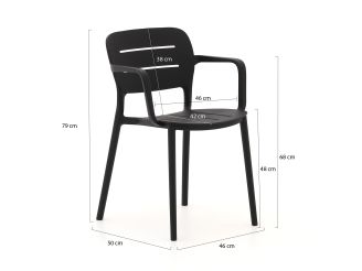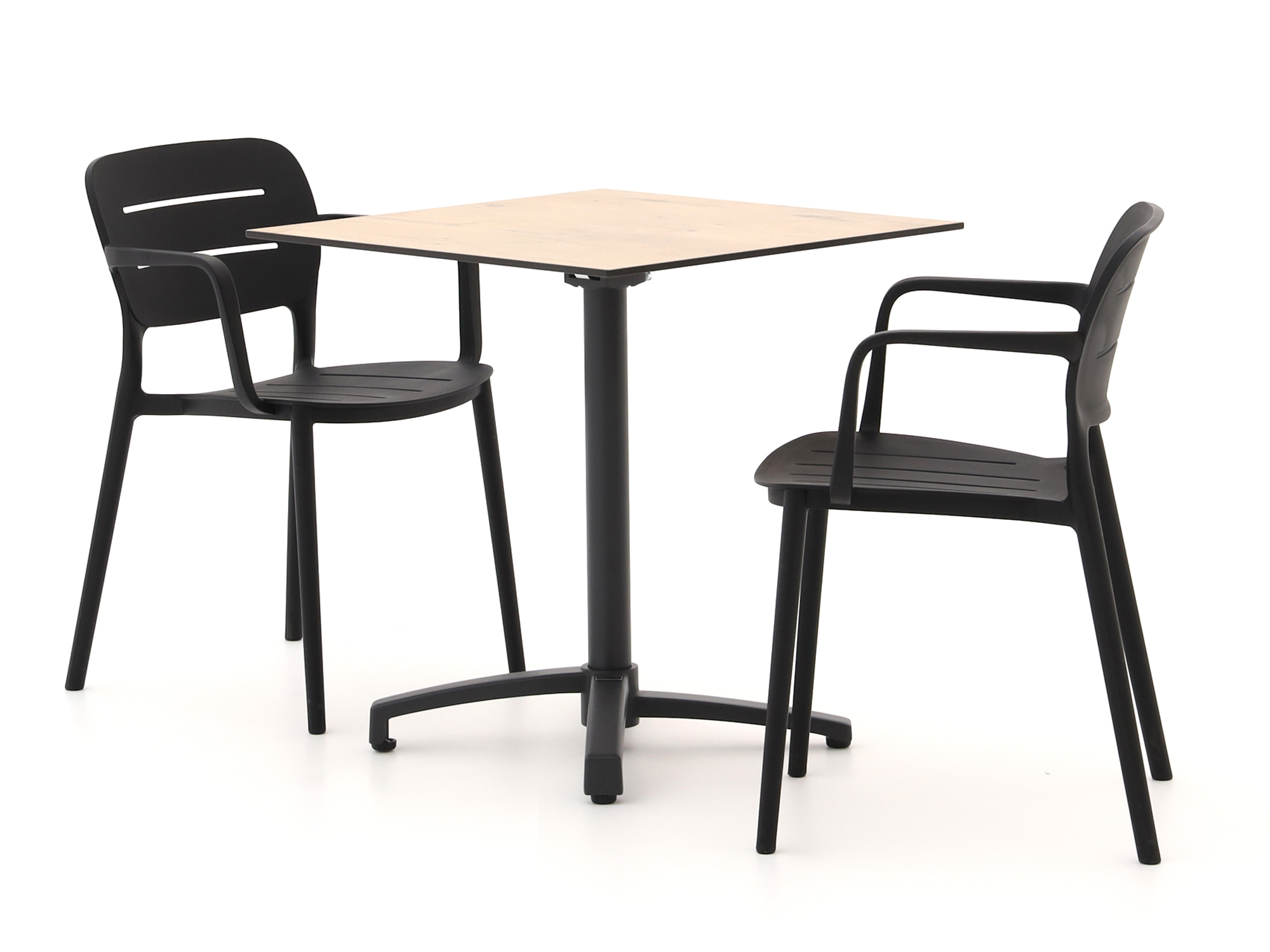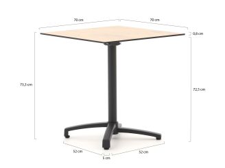 De Forza Pazzia/Canzo 70cm dining tuinset is een compacte en stijlvolle toevoeging aan je buitenruimte. Met zijn strakke zwarte kleur en HPL teak look tafelblad, biedt deze set een moderne uitstraling zonder in te boeten op functionaliteit. De set is ideaal voor een knusse hoek op je balkon of een gezellig plekje in de tuin. Dankzij het stapelbare ontwerp van de stoelen bespaar je ruimte wanneer je ze even niet nodig hebt. Het aluminium onderstel van de tafel zorgt voor een stevige basis, terwijl het kunststof materiaal van de stoelen en het tafelblad onderhoudsarm en weerbestendig is. Zo kun je zonder zorgen genieten van een ontspannen maaltijd in de buitenlucht.