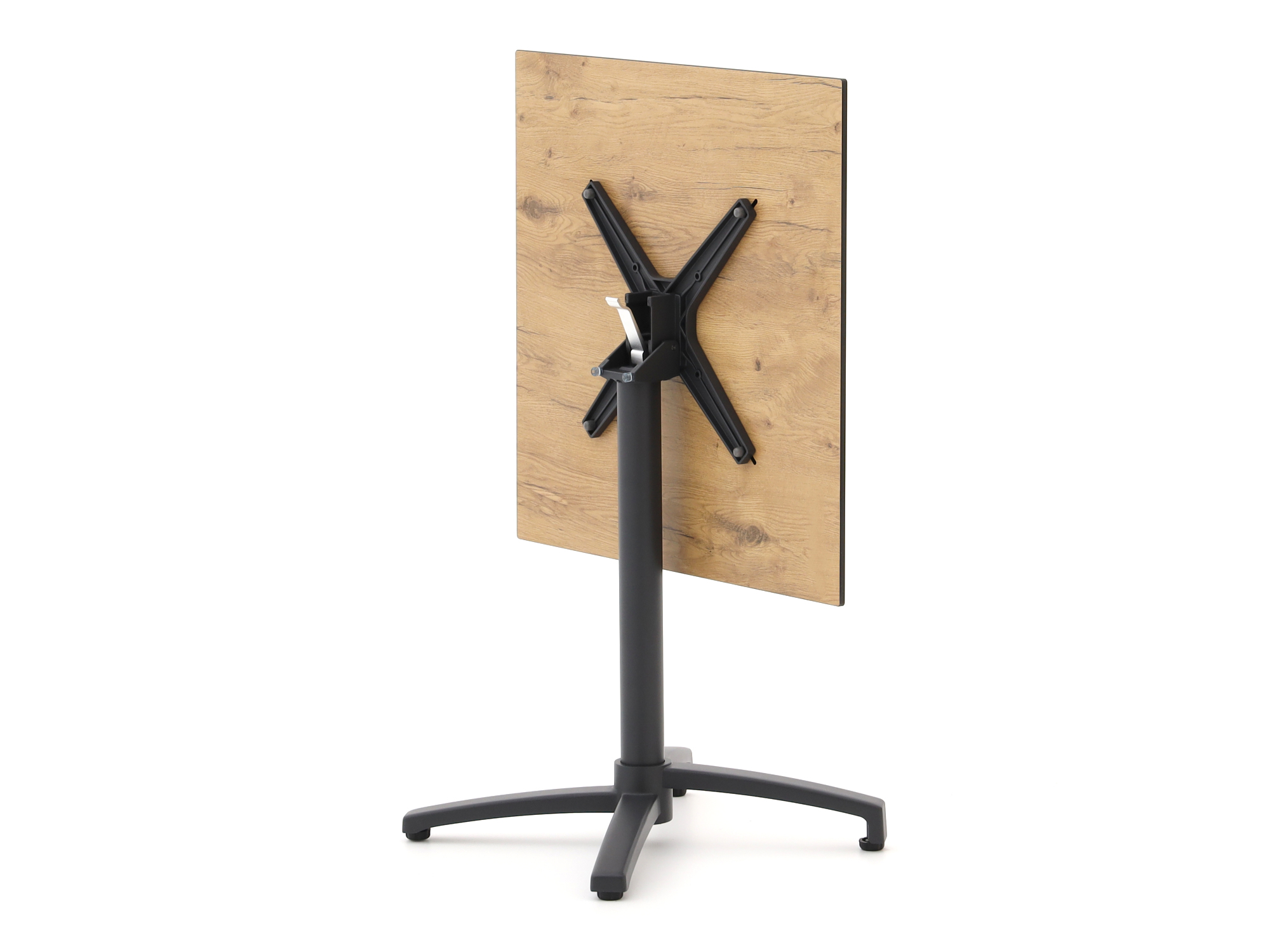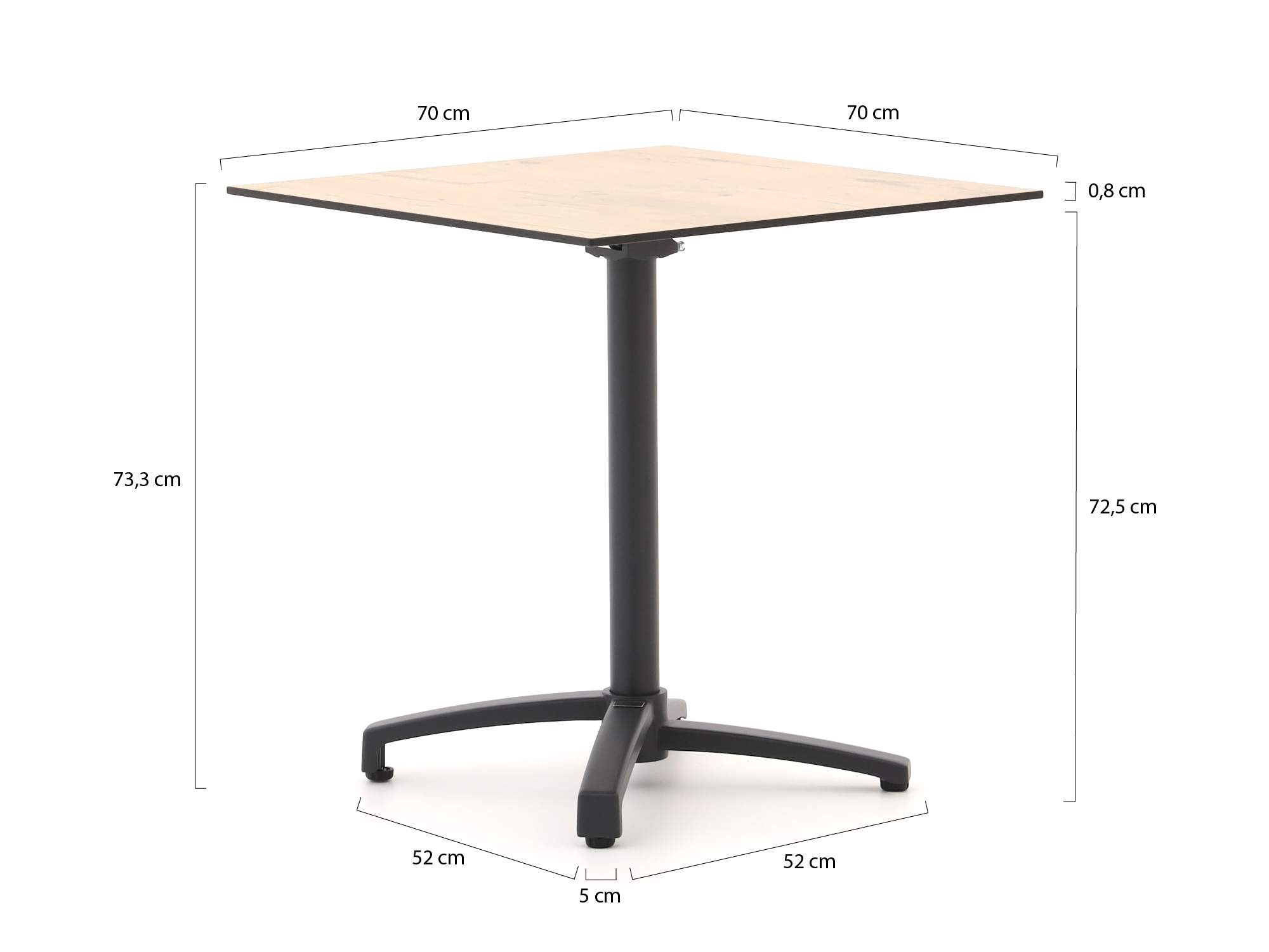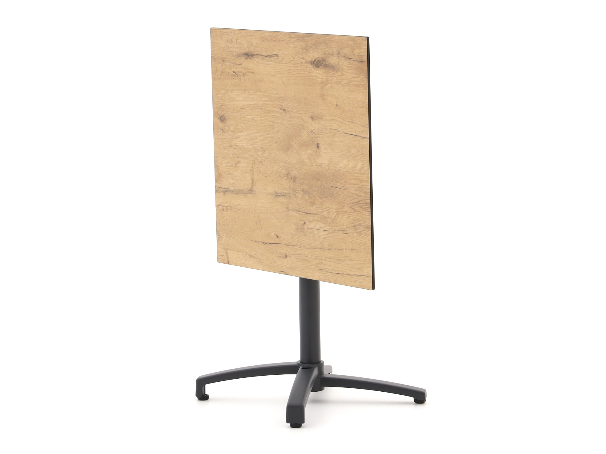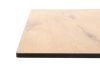 HPL tafelblad met teak look: Dit materiaal is kras- en vlekbestendig, en blijft mooi in elk type weer. Het geeft de tafel een warme, natuurlijke uitstraling zonder het onderhoud van echt hout.