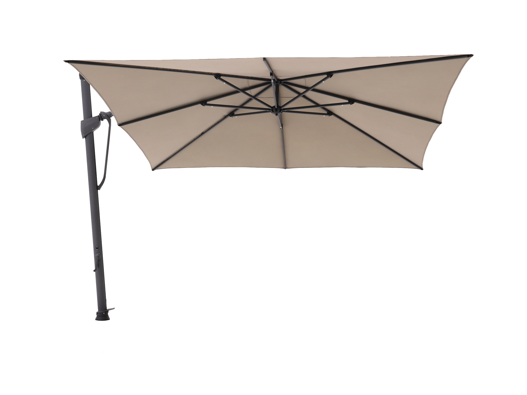 Dankzij de zwevende constructie zit er niks in de weg. Je hebt alle ruimte onder het doek, ideaal bij een eettafel of loungeset.