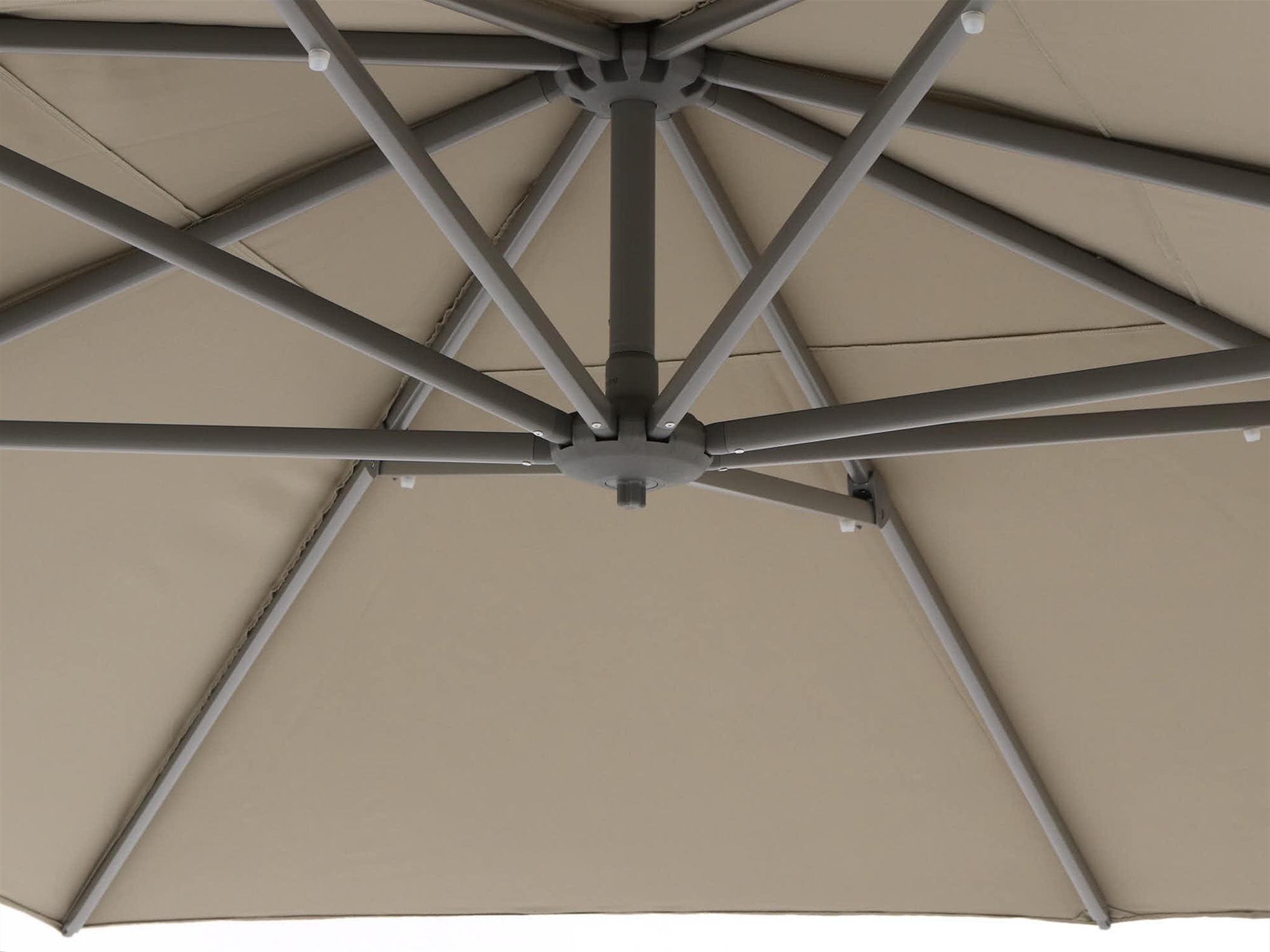 Detailfoto van de kwaliteit van een beige parasoldoek