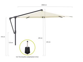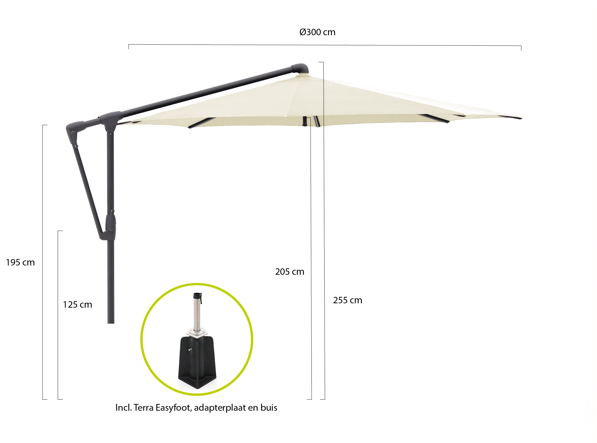 Mooi parasol waar je veel kanten mee op kan. We hebben gekozen voor een vaste voet zodat je er niet overheen struikelt.