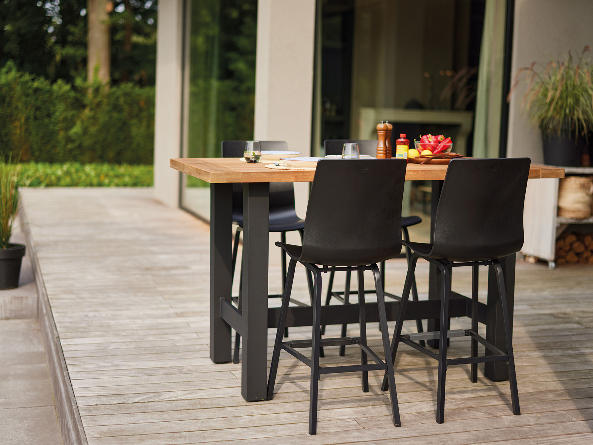 De smalle barkrukken nemen minder ruimte in en passen makkelijk op je terras