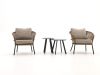 Een compact loungesetje voor twee, bedoeld voor balkons en kleine terrassen. De handgevlochten naturel wicker geeft een warme uitstraling en de opname met kussens maakt ‘m meteen uitnodigend. Het tafelblad is van gecoat metaal, dus je kunt zonder veel gedoe een hapje en drankje kwijt. Geen poespas, gewoon een knusse plek om koffie of een glas wijn te zetten.