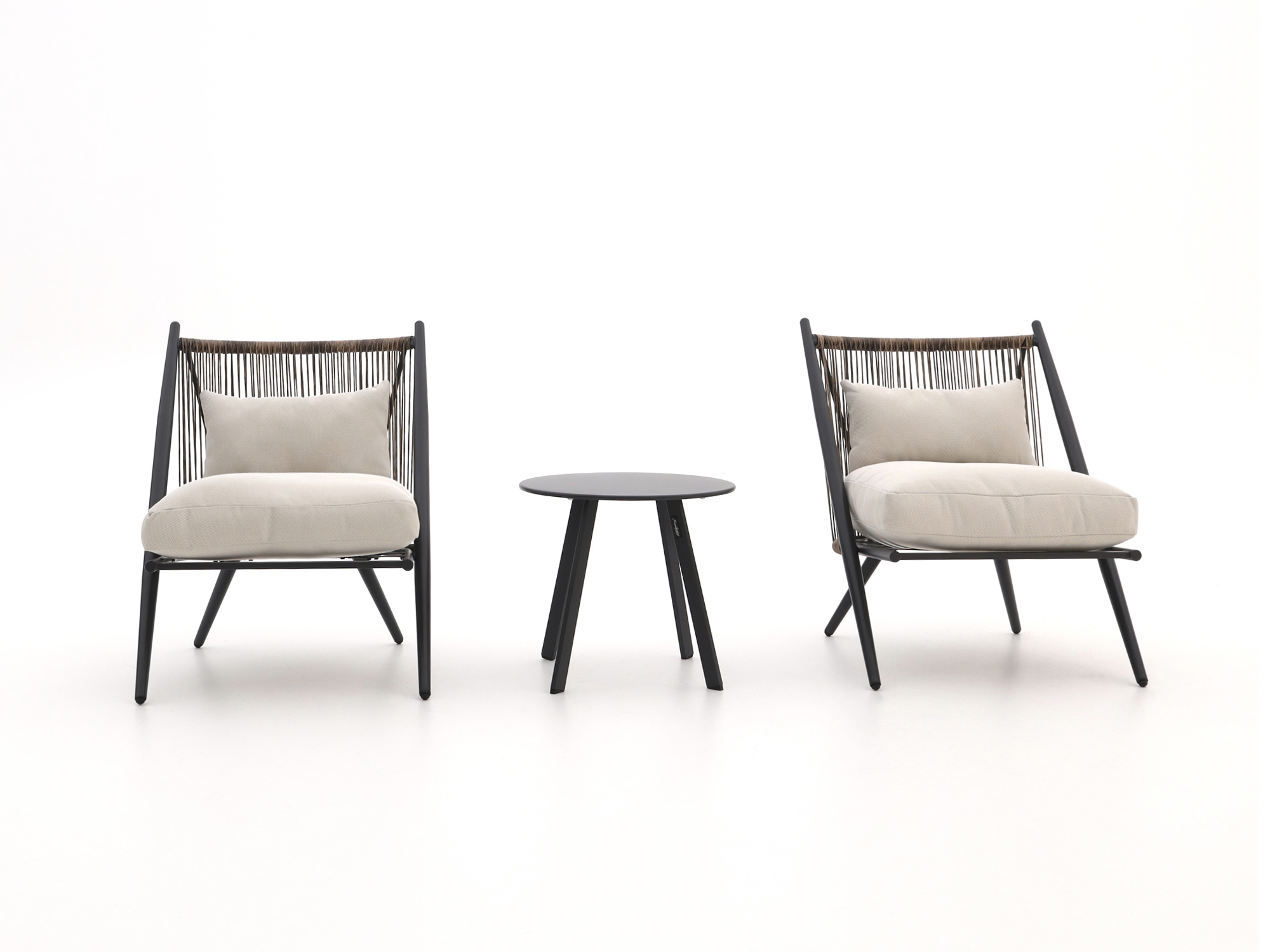 Een compacte balkonset voor twee, inclusief naturel kussens zodat je meteen kunt gaan zitten. Het tafelblad is charcoal (dus zwart) en heeft een gecoate metalen laag die makkelijk schoon te houden is. Het ronde voetenbankje werkt net zo goed als bijzettafeltje en neemt weinig ruimte in. Handig als je van een klein plekje buiten lekker wilt loungen zonder gedoe met losse meubels.