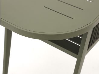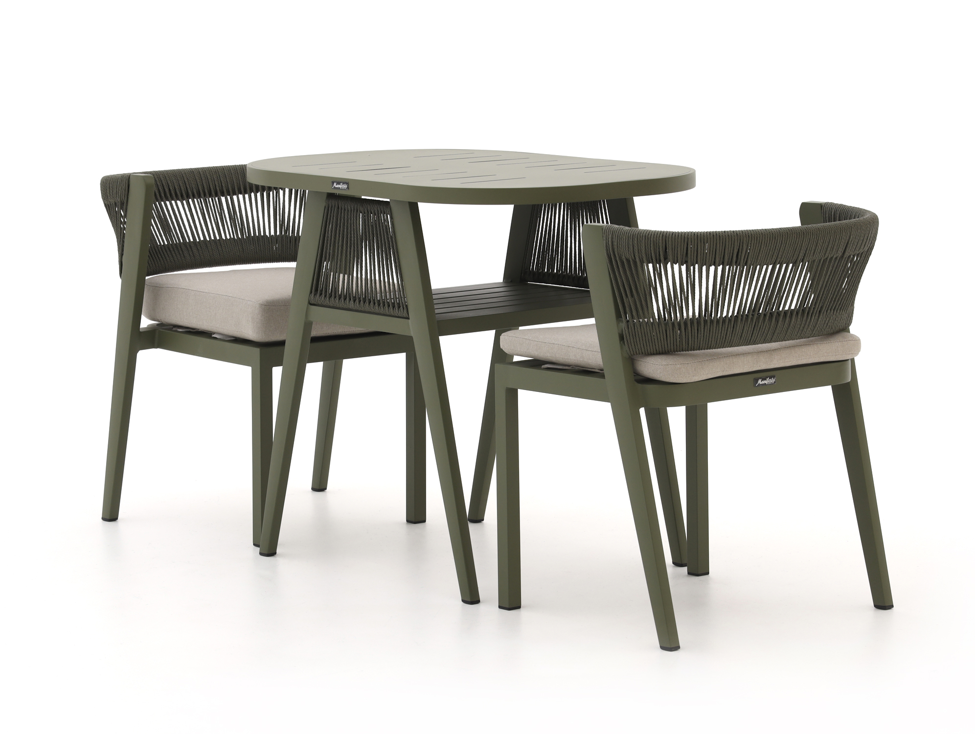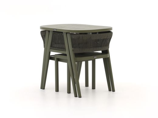De Manifesto Borsea balkonset is een compacte set voor 2 personen, ideaal als je een klein balkon hebt maar wel fijn buiten wilt zitten. De combinatie van licht aluminium en kunststof maakt de set makkelijk te verplaatsen en onderhoudsarm, dus je bent niet je hele zondag aan het poetsen. De ronde tafel en twee stoelen in groen zorgen voor een rustige, eenheid op je balkon, zonder dat het volgebouwd voelt. De meegeleverde kussens maken het zitcomfort net wat zachter, zodat je er prettig op kunt ontbijten, borrelen of gewoon een boek lezen.