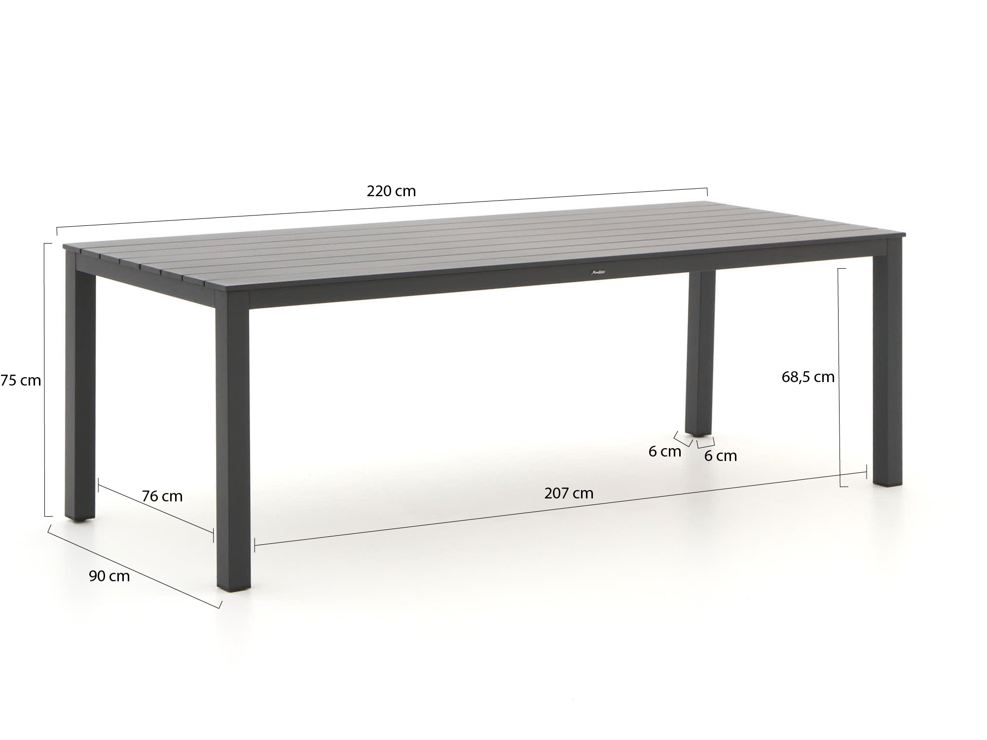 • Aluminium tafelblad met poedercoating: De coating beschermt tegen roest en verkleuring, zodat je zorgeloos buiten kunt tafelen.