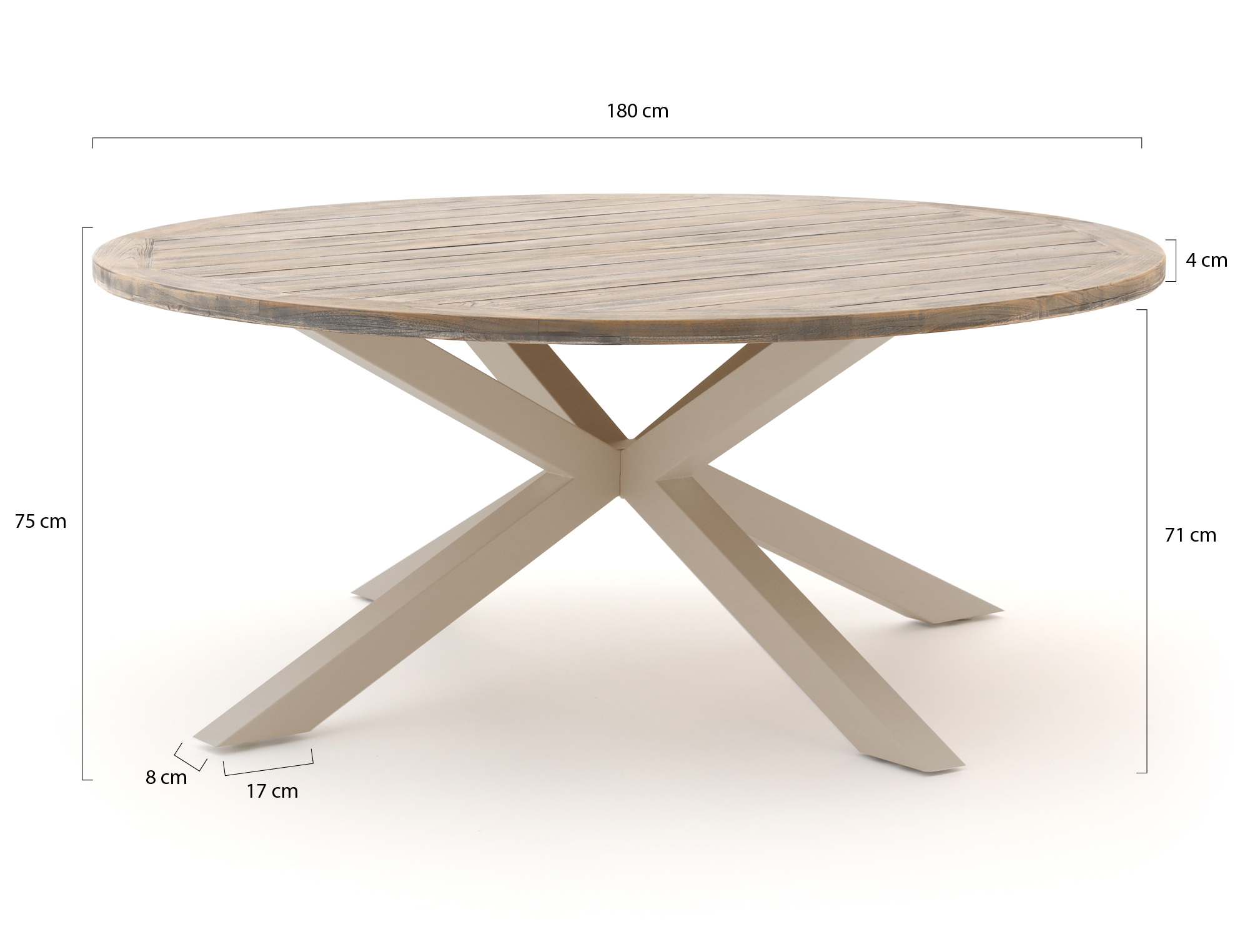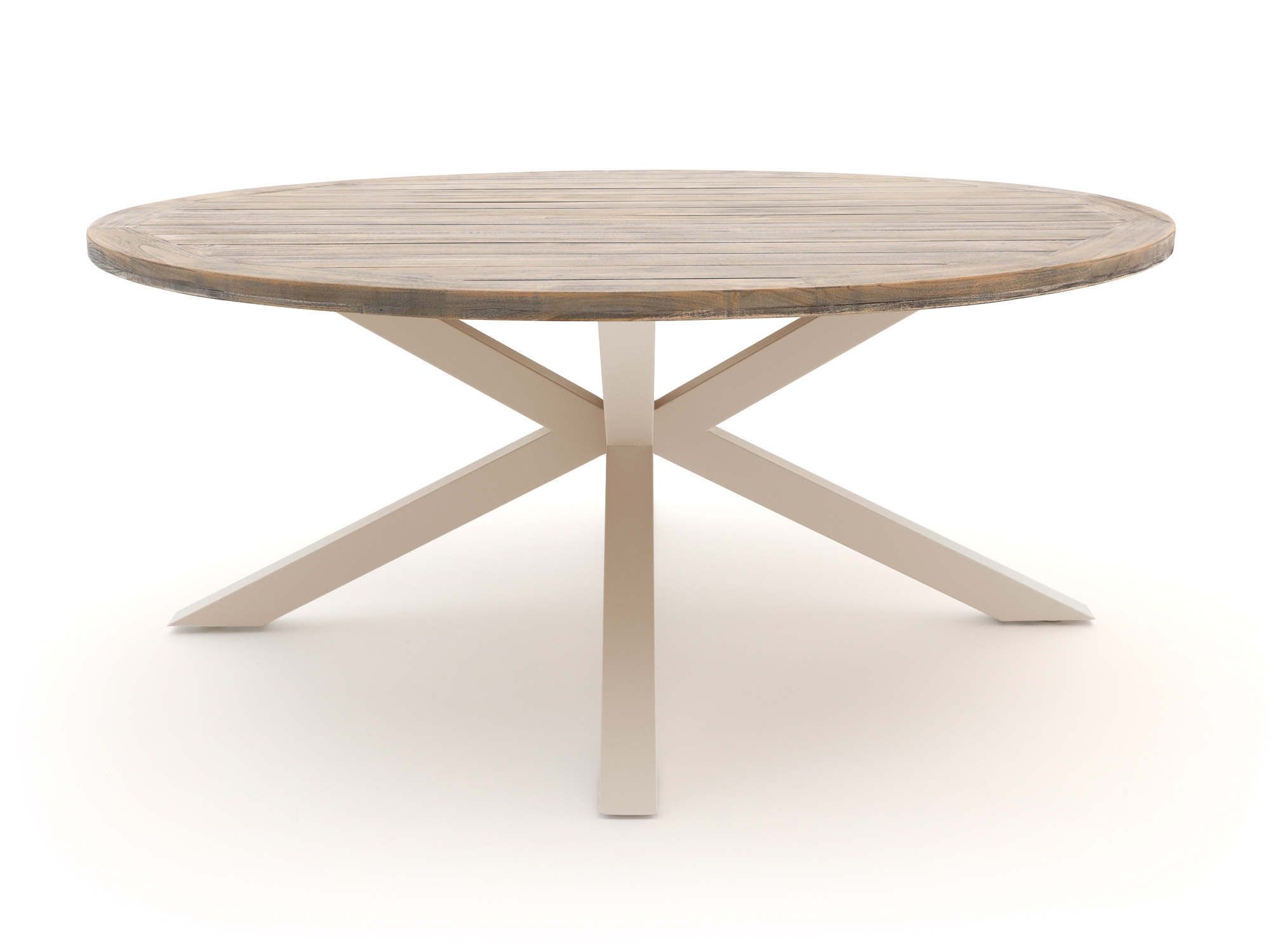 De ROUGH Y dining tuintafel met rond tafelblad van 180 cm is een stevige eettafel voor wie graag met 6 personen lang tafelt in de tuin. Het teakhouten blad in een grijsbruine old teak kleur geeft een rustige, natuurlijke look, terwijl het aluminium onderstel in beige licht van gewicht en weerbestendig is. Door de ronde vorm kijk je elkaar altijd aan, handig voor lange zomeravonden met eten en borrels zonder “hoekplekjes”. Met een hoogte van 75 cm zit je net als aan een gewone eettafel, waardoor je veel soorten tuinstoelen kunt combineren, zolang de armleuningen maar onder het blad passen. Dit is een logische keuze als je een robuuste, natuurlijke tuintafel zoekt die buiten kan blijven staan en die je niet elke keer wilt verslepen.