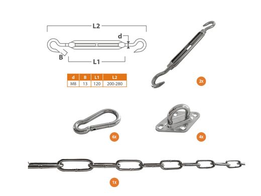 De set is gemaakt van RVS, waardoor de onderdelen goed bestand zijn tegen buitengebruik. Dankzij de M8 spanner stel je de spanning van je schaduwdoek precies af, zodat het doek strak hangt en minder klappert in de wind. Dat is prettiger zitten én beter voor de levensduur van je doek. Deze bevestigingsset gebruik je in combinatie met een vierkant schaduwdoek; het doek en eventueel extra montagemateriaal bestel je los als dat nodig is voor jouw situatie.