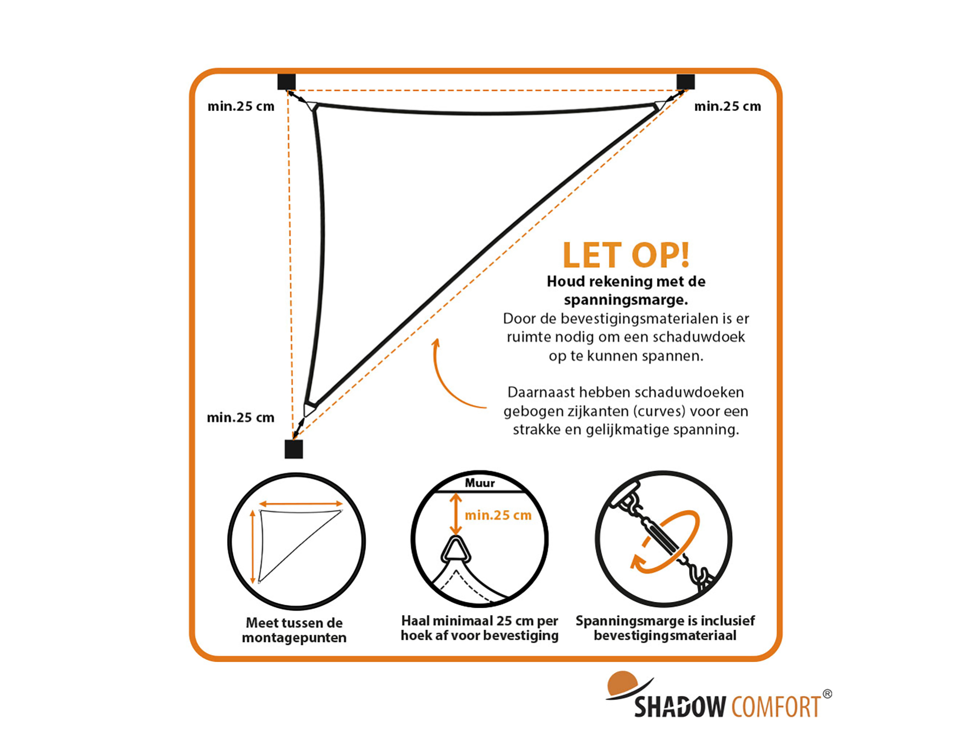 Dit schaduwdoek is voorzien van stevige ringen op de hoeken, zodat je het snel en veilig kunt bevestigen aan bijvoorbeeld muur, paal of pergola. Houd bij het ophangen rekening met een spanningsmarge van minimaal 25 cm rondom, zodat er genoeg ruimte is voor de bevestigingsmaterialen en je het doek mooi strak kunt trekken. De zijkanten zijn licht gebogen (curves); dat helpt om het doek gelijkmatig onder spanning te zetten en voorkomt dat het gaat klapperen. Bevestigingsmateriaal wordt niet standaard meegeleverd, zodat je zelf kunt kiezen wat past bij jouw situatie en ondergrond.
