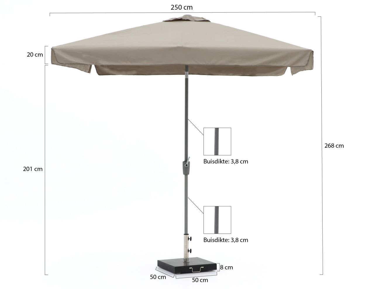 Inclusief parasolvoet: De parasol wordt geleverd met een stevige voet van 50 kg. Zo staat hij altijd stabiel en is hij direct klaar voor gebruik. Superhandig!