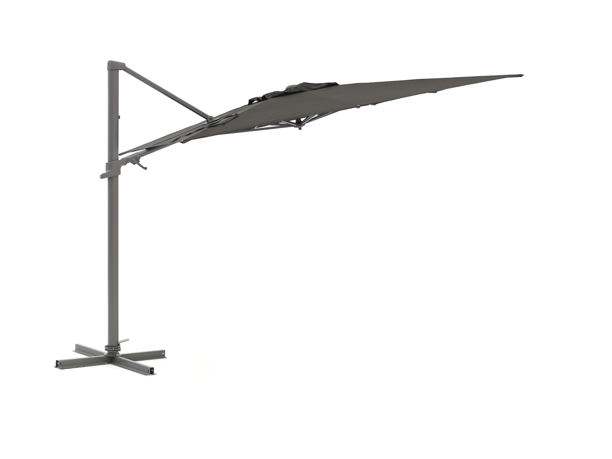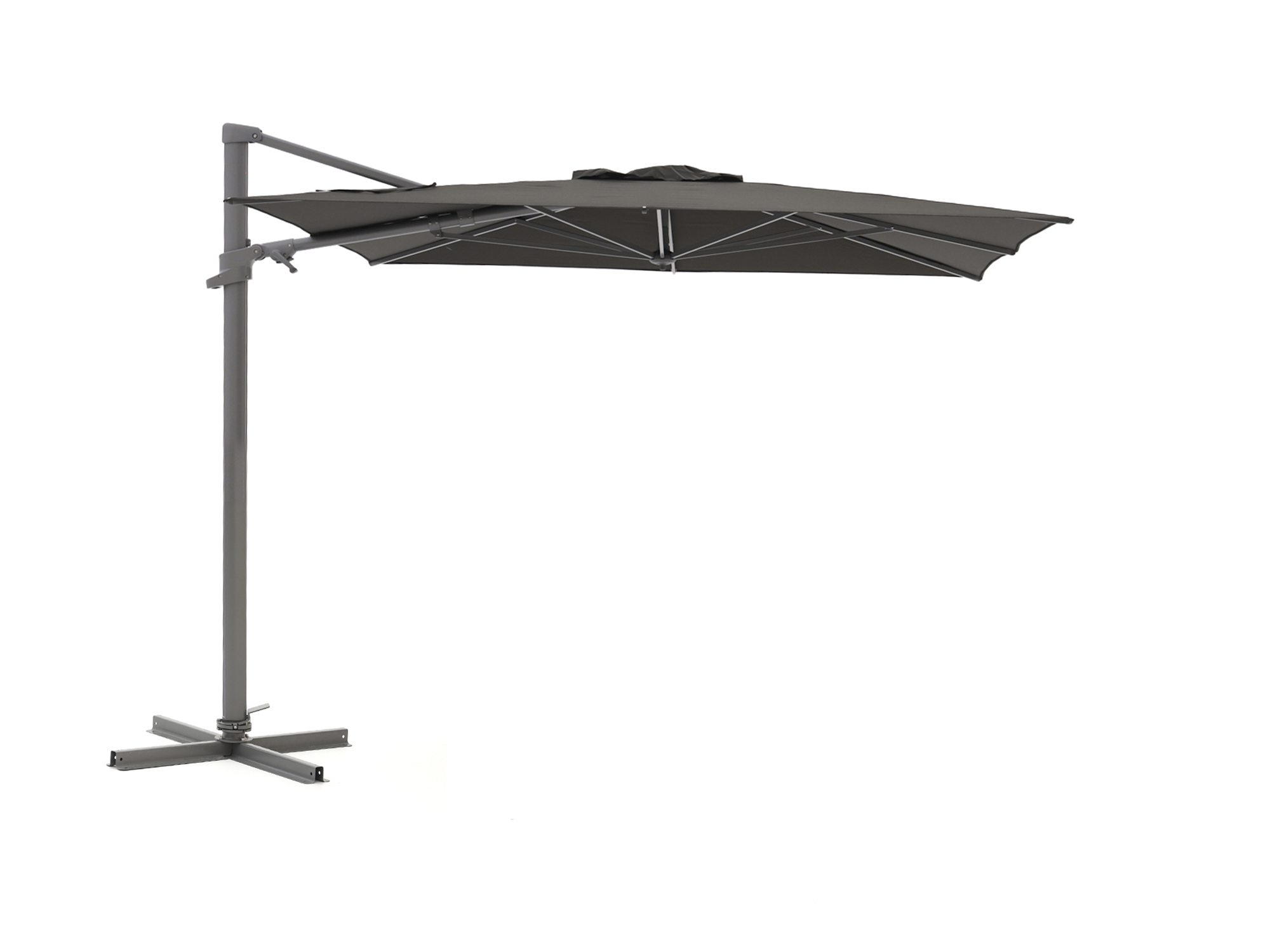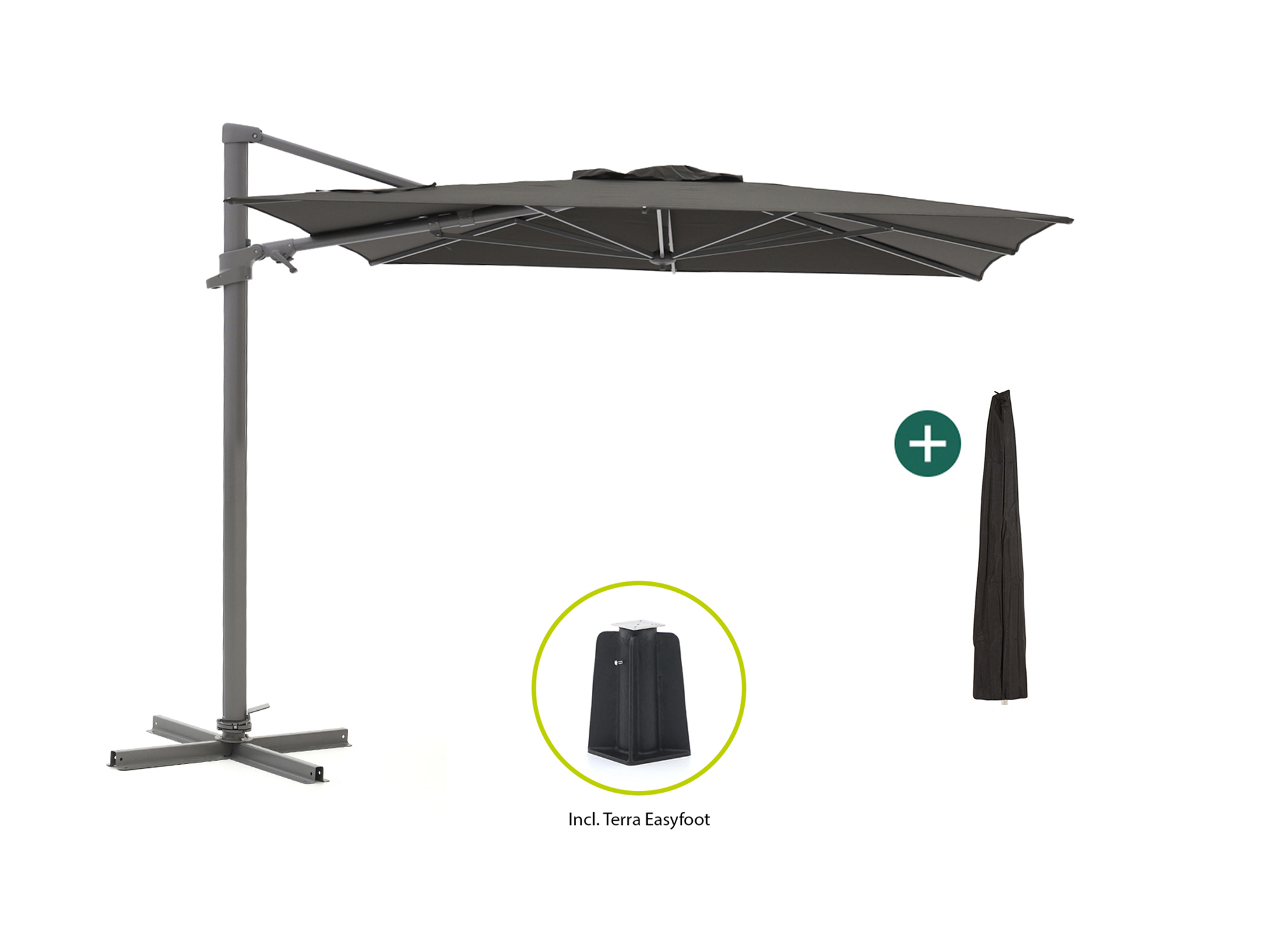 Dankzij de zwevende constructie zit er niks in de weg. Je hebt alle ruimte onder het doek, ideaal bij een eettafel of loungeset.