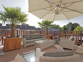 sfeerbeeld zweefparasol boven een loungeset