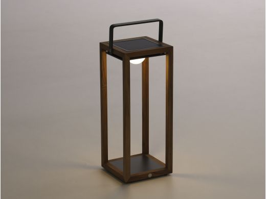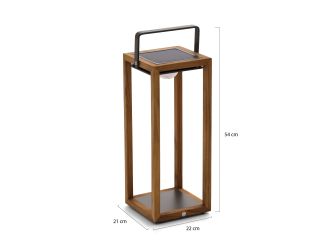 Een lantaarn die je buiten meteen een warme gloed geeft. Het licht is warm wit, fijn voor lange avonden. Zet hem neer waar jij wilt, hij is draadloos en compact. Geschikt voor binnen en buiten, dus hij gaat overal mee. Opladen kan in de zon of met de meegeleverde USB kabel. Na ongeveer 5 uur laden kies je uit drie lichtstanden. De led zit er al in en is afneembaar, je hoeft niets extra te kopen. Afmetingen: 21 x 22 x 54 cm, gemaakt van aluminium en teak.