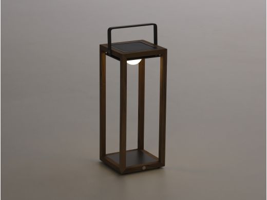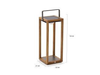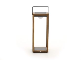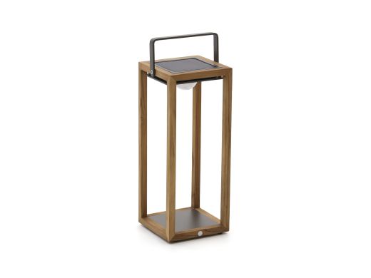 Zet de lantaarn neer op tafel of naast de lounge en je hebt meteen warm wit licht voor een avondborrel of een stille ochtend met koffie. Hij werkt draadloos en is compact, dus verplaatsen gaat zo. Opladen kan op twee manieren: overdag in de zon of binnen met de USB kabel. Op de laagste stand brandt hij tot 18 uur, op de hoogste 7 uur. Met IP65 is deze lantaarn echt buitenproof en geschikt voor binnen en buiten. De LED lichtbron zit erbij en is afneembaar, handig bij opladen of opbergen. Gemaakt van teak en aluminium, formaat 21 x 22 x 54 centimeter. Je krijgt 2 jaar garantie.