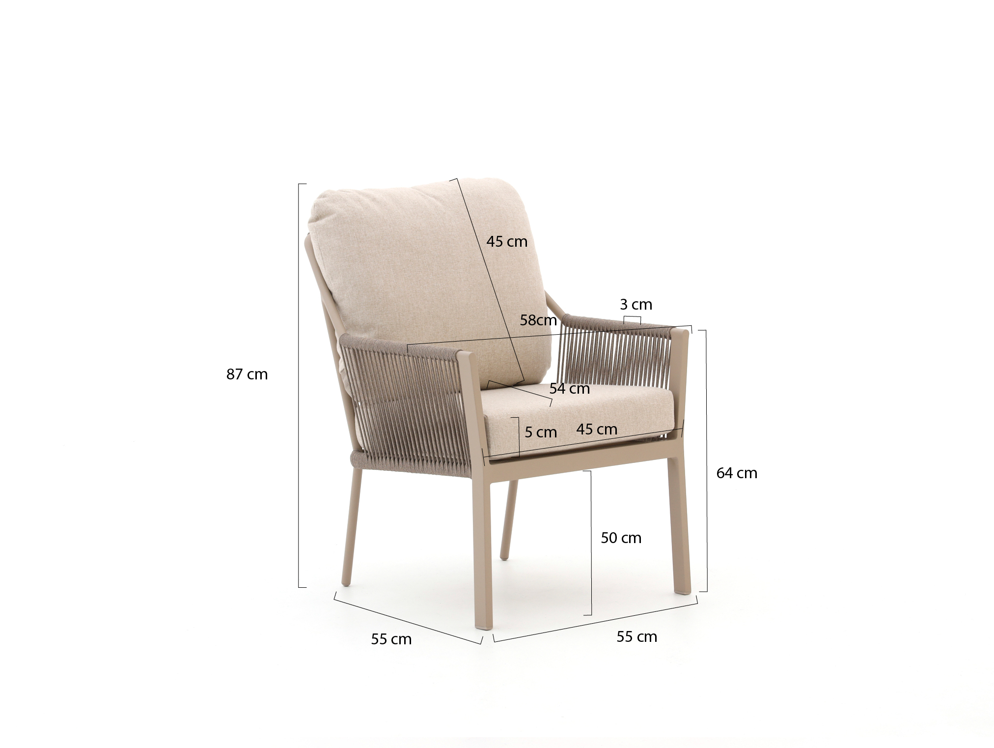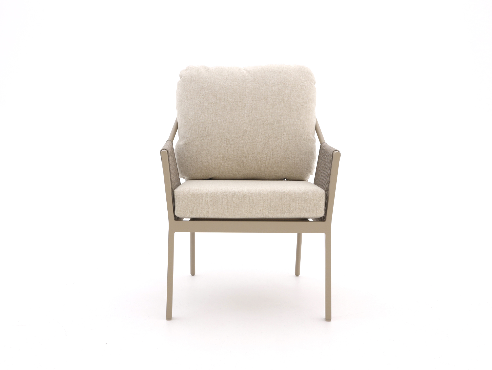 De Tierra Outdoor Liv low dining tuinstoel beige is een fijne stoel als je graag lang en ontspannen aan tafel zit. Je zit wat lager dan op een gewone diningstoel, waardoor het net tussen loungen en dineren in zit. Het aluminium frame is licht van gewicht, dus je tilt de stoel makkelijk even op als je je terras verschuift. De rope zitting vormt zich licht naar je lichaam en droogt snel op na een regenbui. De meegeleverde kussens zorgen voor extra zacht zitten, ideaal voor lange avonden buiten.