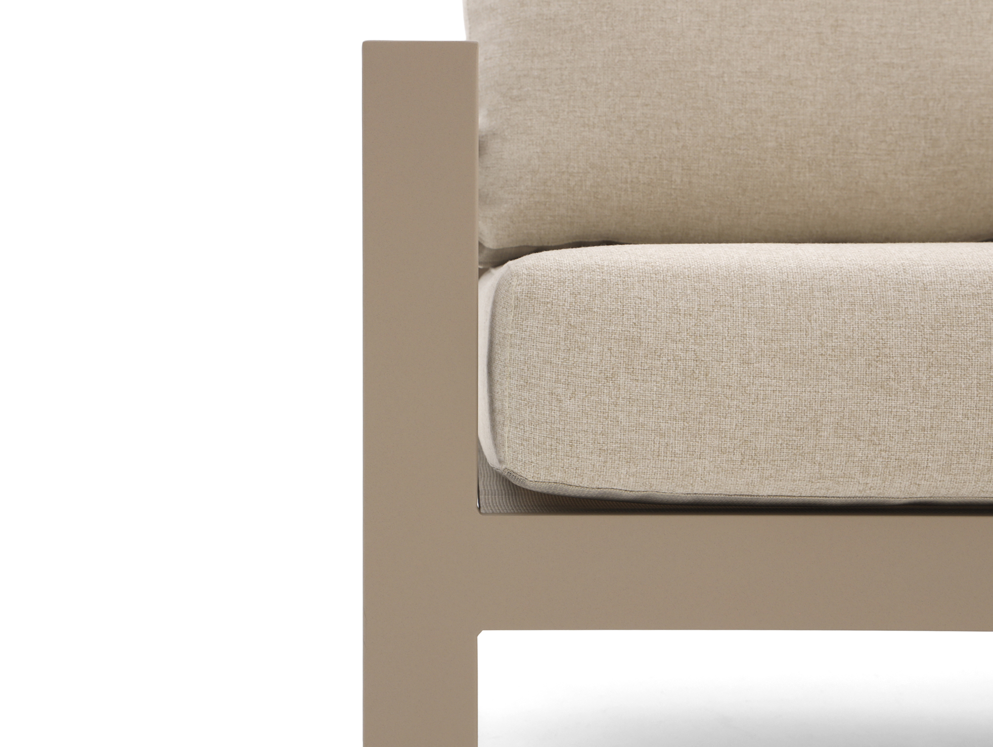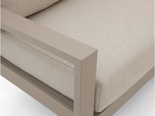De Tierra Outdoor Musone loungemodule met rechterarm is een 2 persoons loungebank die je gebruikt als onderdeel van je Musone loungeset, of gewoon los tegen een muur of schutting. Het aluminium frame is licht van gewicht en kan niet doorroesten, dus je tilt hem makkelijk op als je het terras wilt schoonmaken of de opstelling wilt verschuiven. De beige kussens zitten er al bij, dus je hoeft niet meer te zoeken naar passende kussens en je kunt direct neerploffen. De bekleding is van olefin, een sterke outdoor stof die mooi blijft, ook als je er vaak op zit. Handig als je een loungeset wilt samenstellen die precies past op jouw terras, zonder puzzelen met standaard maten.